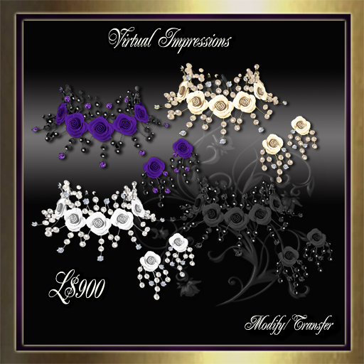 And finally a Necklace & Earrings with Colour Change Hud. The Hud, Necklace & Earrings have 1 script each . So low lag. You may choose from 6 Metals and Black or White Diamonds with Large Marquise Stones and drops have a choice of 21 gemstones. See Pic at the Top.